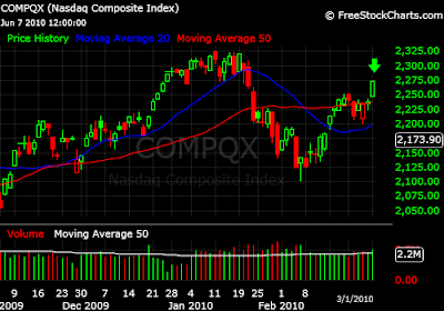 Take for example, APKT, this was one of the leading stocks from the previous up trend that begun in late February - early March 2010. The green arrow on the chart of the NASDAQ marks the follow through day and the green on the chart of APKT marks the optimal buy point.